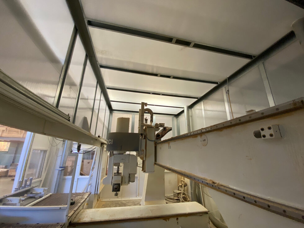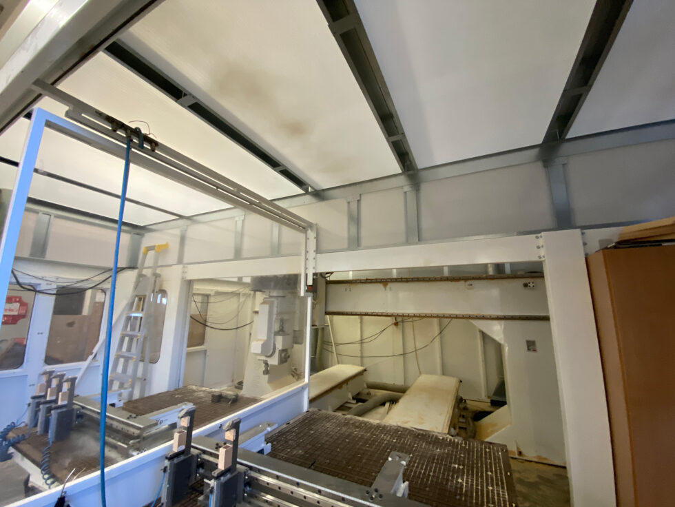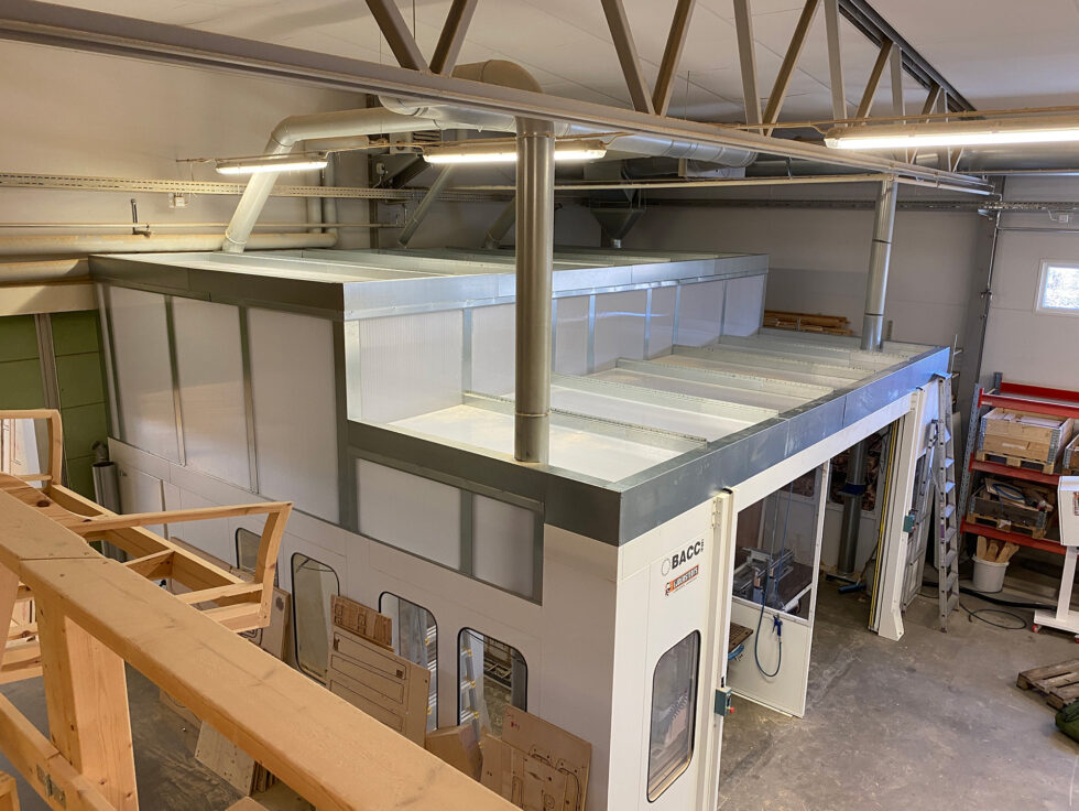 Denna maskin levererades utan huvar för att ansluta spånutsug. För att inte få hela snickeriet fullt av trädamm monterade vi in huvar och klädde in hela maskinen med ett ramverk i galvaniserad plåt och monterade in plastskivor för ljusgenomsläpp.
